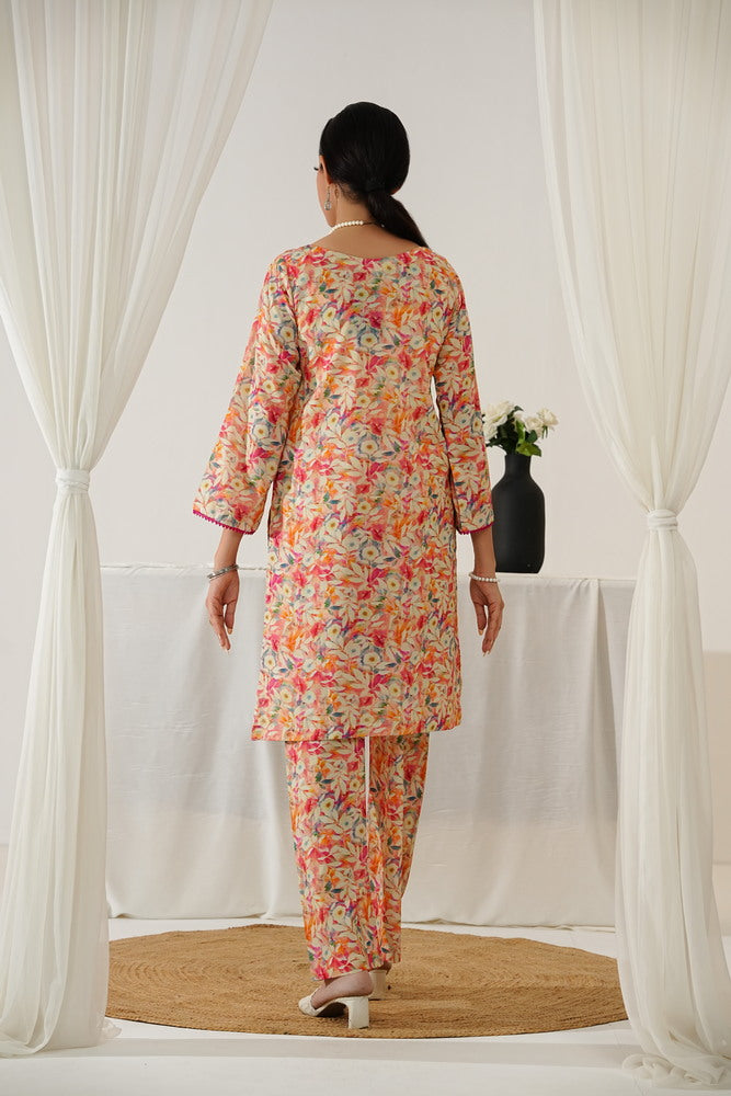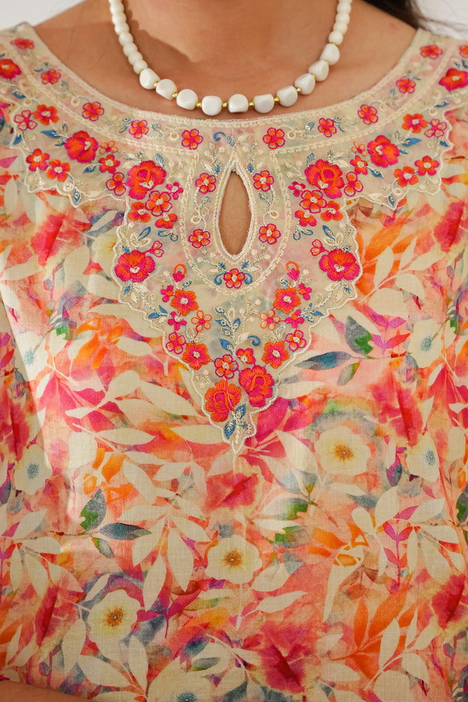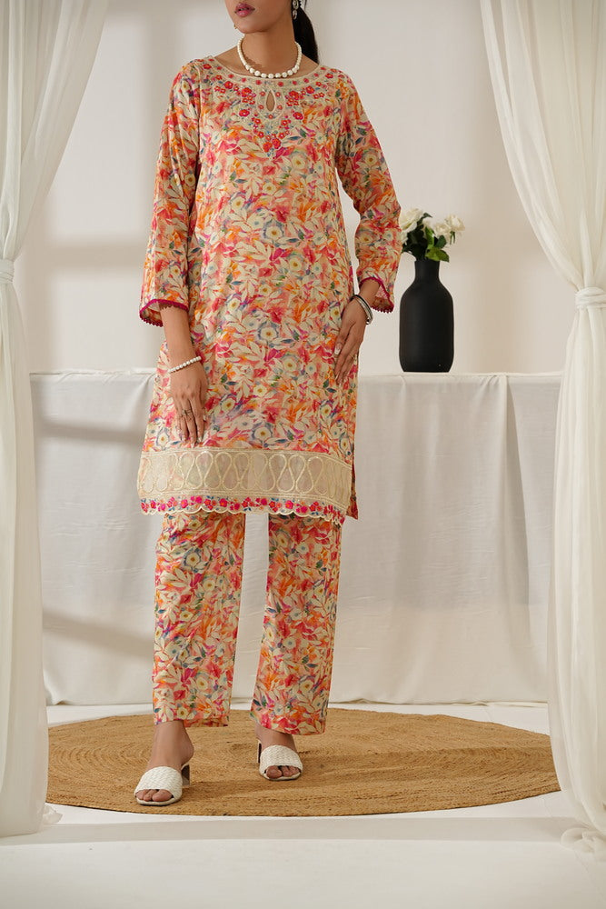 - Shirt : Printed Shirt With Embroidered Neck and Daman
