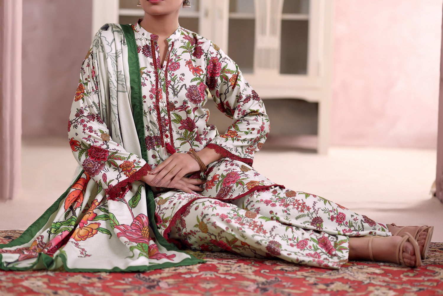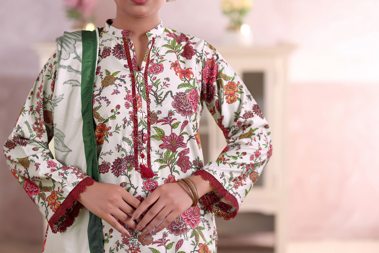 Ready to be enchanted by KHAAS 3PC Karandi Stitched Collection by AIZAL blending timeless elegance with exquisite craftsmanship.
